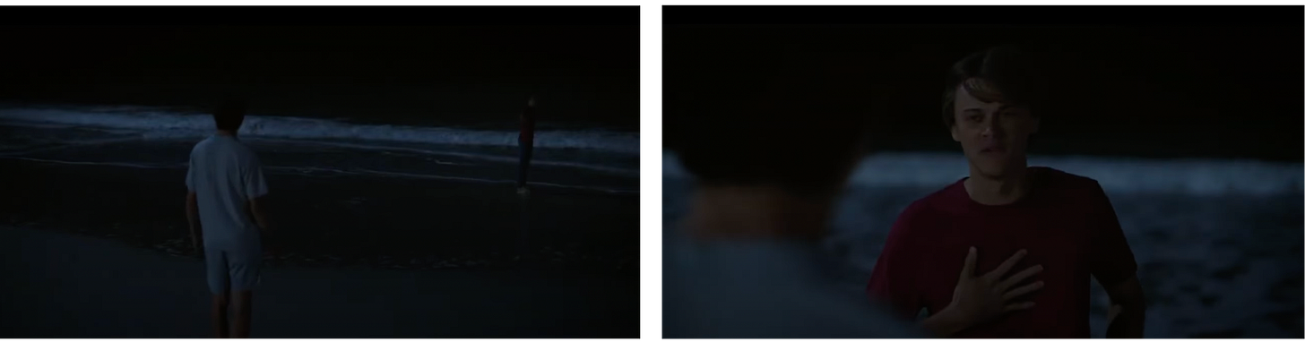 The Summer I Turned Pretty clip has low saturation and lighting only provided by the moon. Though the characters in this show similarly dress in bright colors, the colors are stripped from us in this clip so we must focus instead on what is happening. Zettl (2017) says our eyes “jump into action when it gets dark,” using dim moonlit lighting as an example (p. 54). Conrad’s panic attack and conversation with Steven all occur with only the moon lighting up the scene. This forces the audience to actively follow what’s happening in the clip. They aren’t able to casually view his grief; instead they must be active participants and diligently follow what Conrad’s experiencing in the moment. Between the moonlit scene and ocean in the background, the scene appears somewhat colorless (Zettl, 2017), with a bluish tint. The low saturation provides low energy to the scene, making us feel down (Zettl, 2017). The blue signifies loneliness, further signifying Conrad’s emotional state.