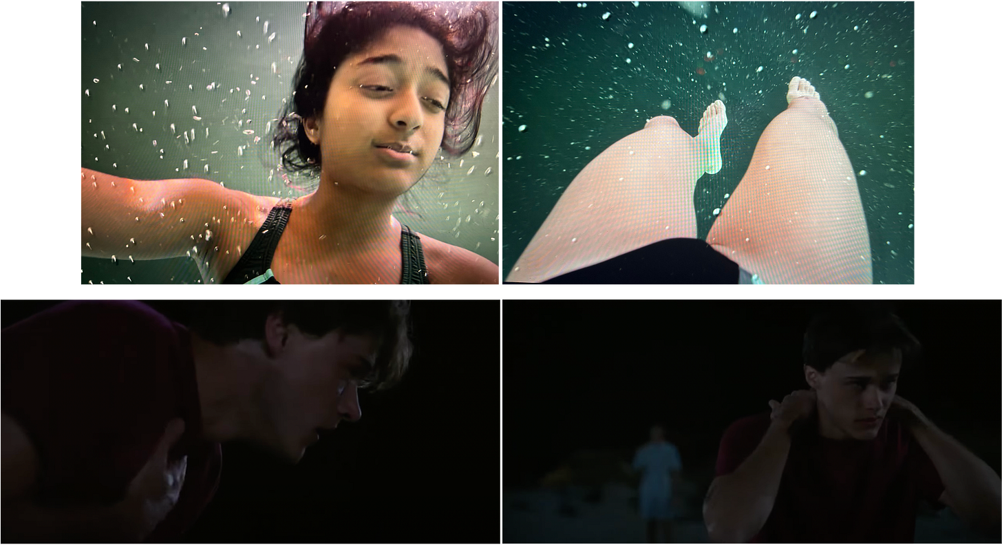 This two-minute-long clip serves as an introduction to Devi, the insurmountable loss of her father, her grief, her dynamic at school, her best friends, and her love interest and perhaps the only thing able to distract her from the depths of her grief. The introduction cuts many times, but the one constant throughout is that we continuously get a look at how Devi is feeling in any given moment through mostly medium shots, and some close-ups, that serve as punctuation at the end of each introduction. Devi’s father dies at her performance and she’s distraught; she sits at her father’s funeral, numb; she’s in the pool, and we intimately see she’s unable to move; she’s at the doctor’s office, confused and upset; she’s back at school, embarrassed, but comfortable with her friends; she’s around Paxton and smiling, the only times we see her smile throughout the clip; then she’s reminded of her grief once again even after being able to walk again.