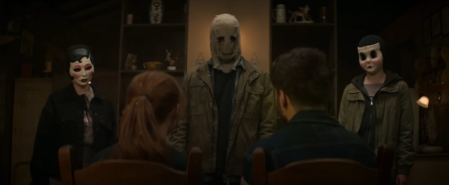 I saw The Strangers: Chapter 1 in theaters this week with husband of GRIEF AND MEDIA PROJECT Jack. First of all, one disagreement we always have is regarding what time to arrive to the movie theaters. Hear me out: If a show is starting at 12:30, I want to be walking up to buy my movie tickets at 12:30. No earlier. This gives me plenty of time to use the restroom once or twice (I’m a nervous pee-er), buy popcorn and leisurely stroll into the theater. At this point, I can find my seat and only have to sit through one or two previews before my movie begins. Yippeee! Unfortunately, this time, Jack got his way. He told me the movie started at 12:30. It started at 12:50. He claims this was by accident—I believe it was done both purposefully and with ill-intent. We took our seats before previews even began—instead, they were showing B2B commercials that I had no business seeing. As you can imagine, I was already very afraid.